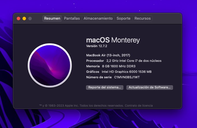 Macbook Air de 13.3″ con procesador Intel i7 de 2.2Ghz y 256GB de Almacenamiento Flash. 8GB Ram.